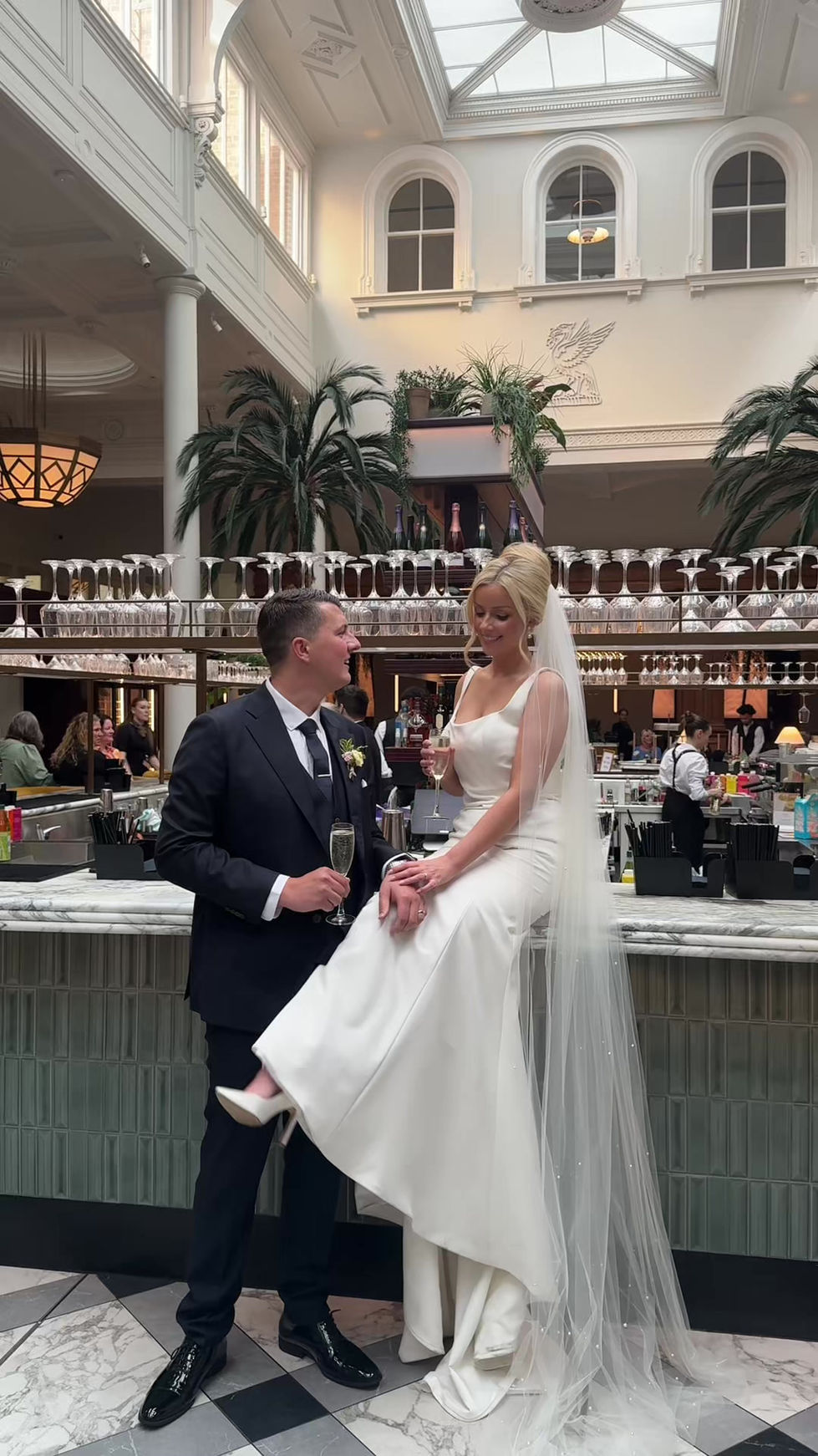 From heartfelt moments on the historic steps to champagne at the bar, Katie’s sleek satin gown and Anthony’s classic black suit perfectly matched the sophistication of the day. Every detail reflected their modern love story with just the right touch of old-world glamour.